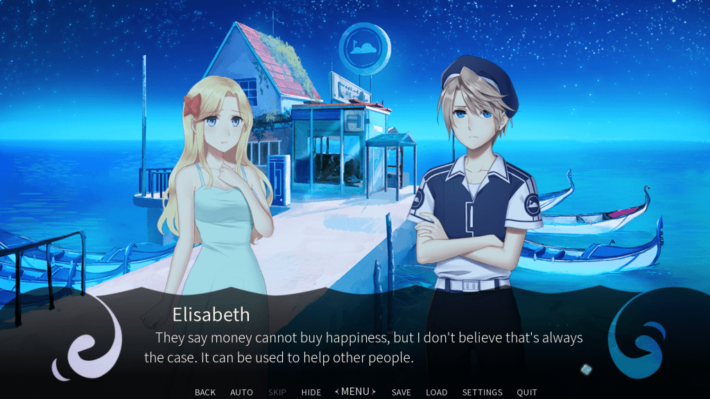 Since we recently talked about original English language visual novels (OELVNs), I thought it might be nice to take a deeper dive into Aquadine, an OELVN from developer SoftColors that I recently read. I mentioned I’m interested in OELVNs with a non-Japanese identity, and Aquadine impressed me not only with its stories and characters, but by building a distinctive setting that doesn’t feel like an imitation.
