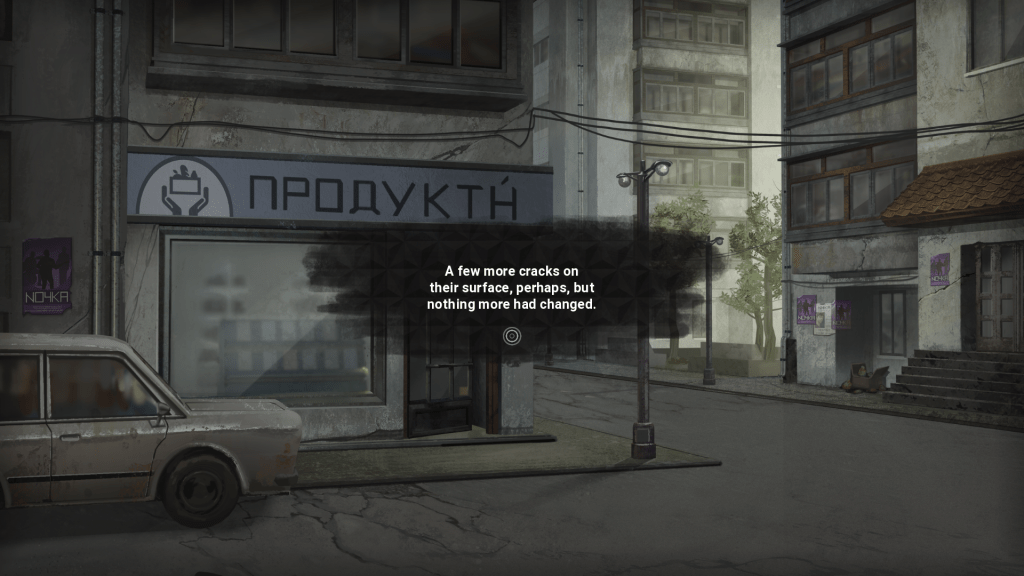 From the moment Yuri alights the bus, the oppressive atmosphere of Nevilyovsk hangs thick, a visceral gloom that infuses all. Rusted husks of cars, pavement cracked and worn, and dilapidated buildings greet him, all brought to life in striking environment art that feels like gazing into a dying world. The monotonous tones and anemic lighting show Nevilyovsk is a place where the body might live, but the soul goes to die. Still those who live there do what they can to make it home. Yuri’s family apartment is equally run down but also filled with small personal touches. Mementos from a family vacation, a poster of Yuri’s favorite movie, and the sounds of his sister Lada’s guitar remind you that even amidst the decay, people hold onto what flickering embers of happiness they can.