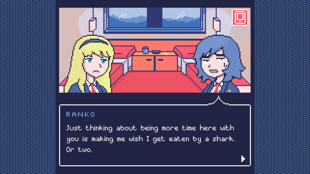 The presentation is impressive too. The menu is designed as Ranko’s smartphone. Besides game controls like save/load and settings, you can access the aforementioned MariNet chats as well as a list of contacts. Each name has a portrait and a brief description so you can keep track of who’s who if you get mixed up. You can even change the phone wallpaper to one of 10 different themes. It’s a small touch, but it helps with the immersion.