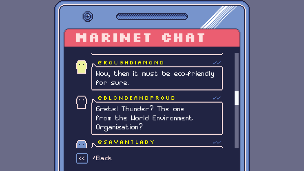 I quite liked Murder on the Marine Express’s art and music. The charming pixel style focuses on big, striking characteristics over intricate details, and it works well with the colorful cast of characters. And the art, along with music reminiscent of MIDI, takes me back to the days of the old school adventure games I played growing up. It’s a fitting aesthetic for a story that aspires to be a classic confined space murder mystery.