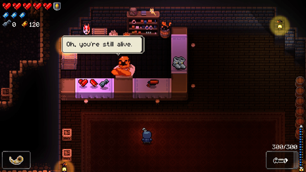 A bad encounter in Enter the Gungeon means you took 1 damage. But Enter the Gungeon punishes you for taking that 1 damage for the rest of the game. It all comes down to opportunity cost. Every time you find a shop you have to decide: should I buy health or a gun or item that makes me more powerful? It’s death by a thousand cuts. One mistake won’t kill your run, but as you delve deeper and your resources dwindle, you’ll feel your inevitable demise slowly closing in.